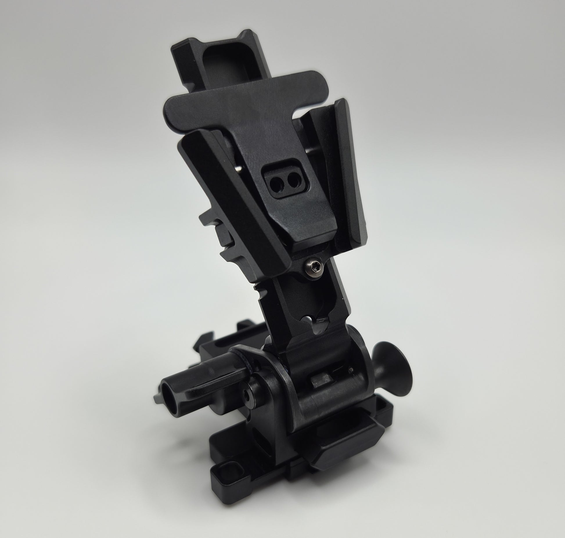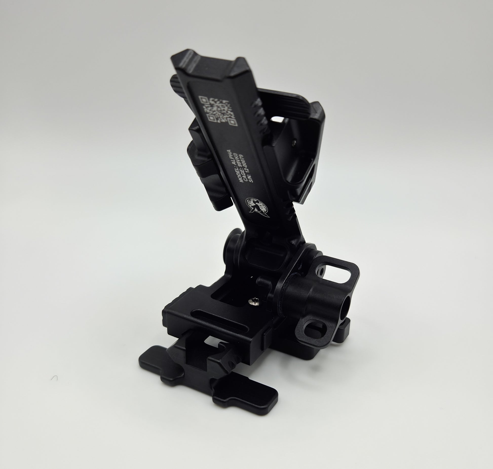The ALPHA Mount sets the standard for night-vision helmet mounts. Weighing just 80 grams, it is the lightest and lowest-profile dovetail shoe interface ever produced. A patent-pending ball-detent mechanism delivers rock-solid lockup in both stowed and deployed positions—eliminating wobble and preventing accidental drop-downs when it matters most.